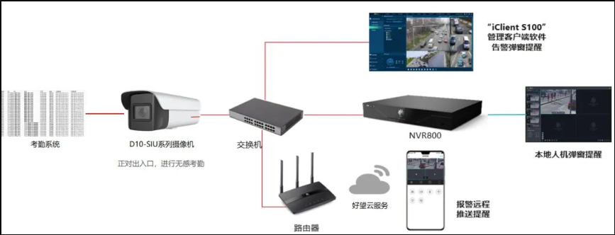 好望無感考勤,通過在出入口部署D10-SIU系列攝像機進行目標識別,實現員工無感考勤,有效規避代打卡考勤作弊的行為,做好考勤和安全管理。