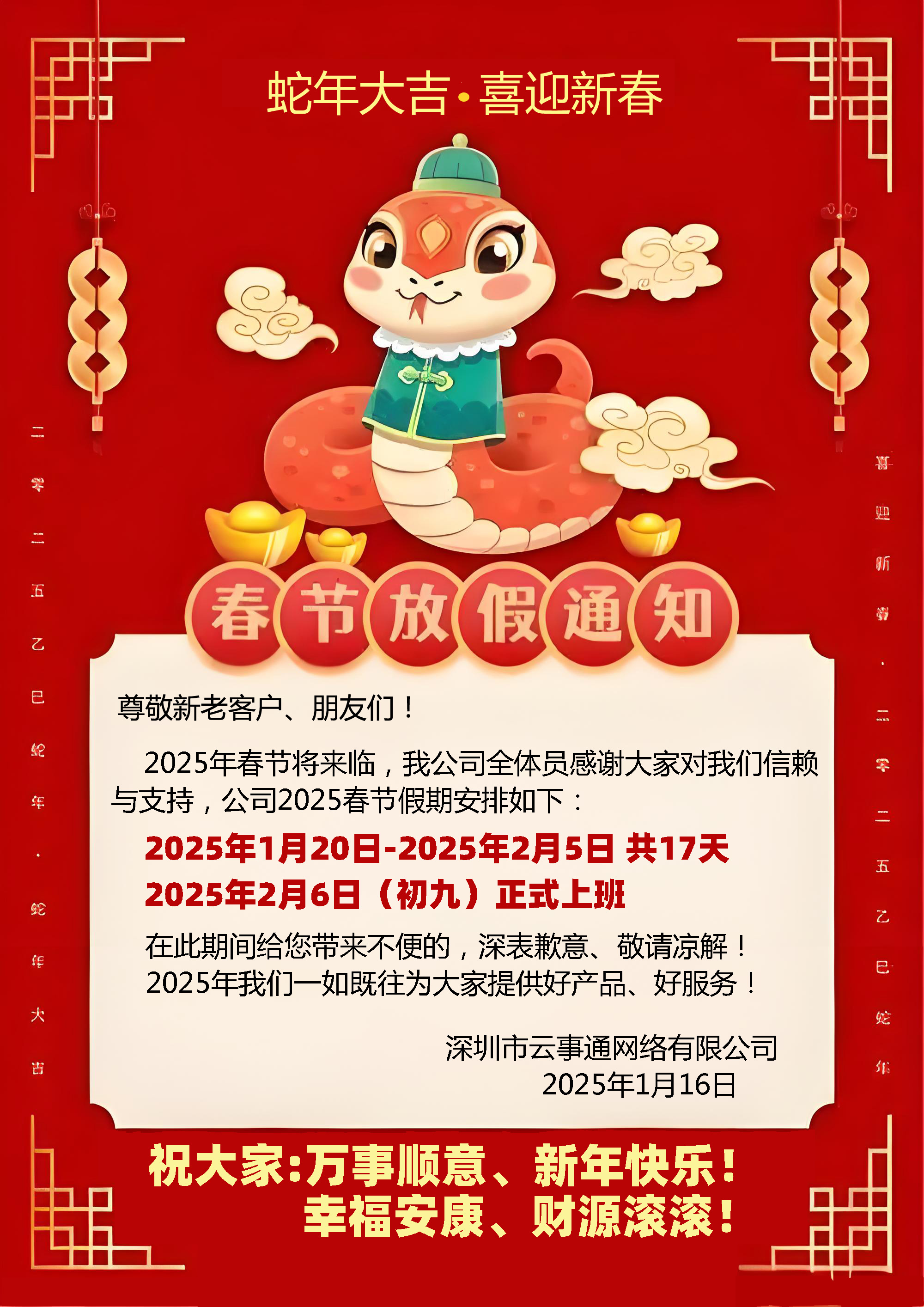 2025年深圳監控安裝公司春節放假通知2025年春節即將來臨,我公司全體員感謝大家對我們信賴與支持,深圳監控安裝公司2025春節假期安排如下:分類:公司新聞關鍵詞:春節放假通知放假通知2025年春節即將來臨,我公司全體員感謝大家對我們信賴與支持,深圳監控安裝公司2025春節假期安排如下: